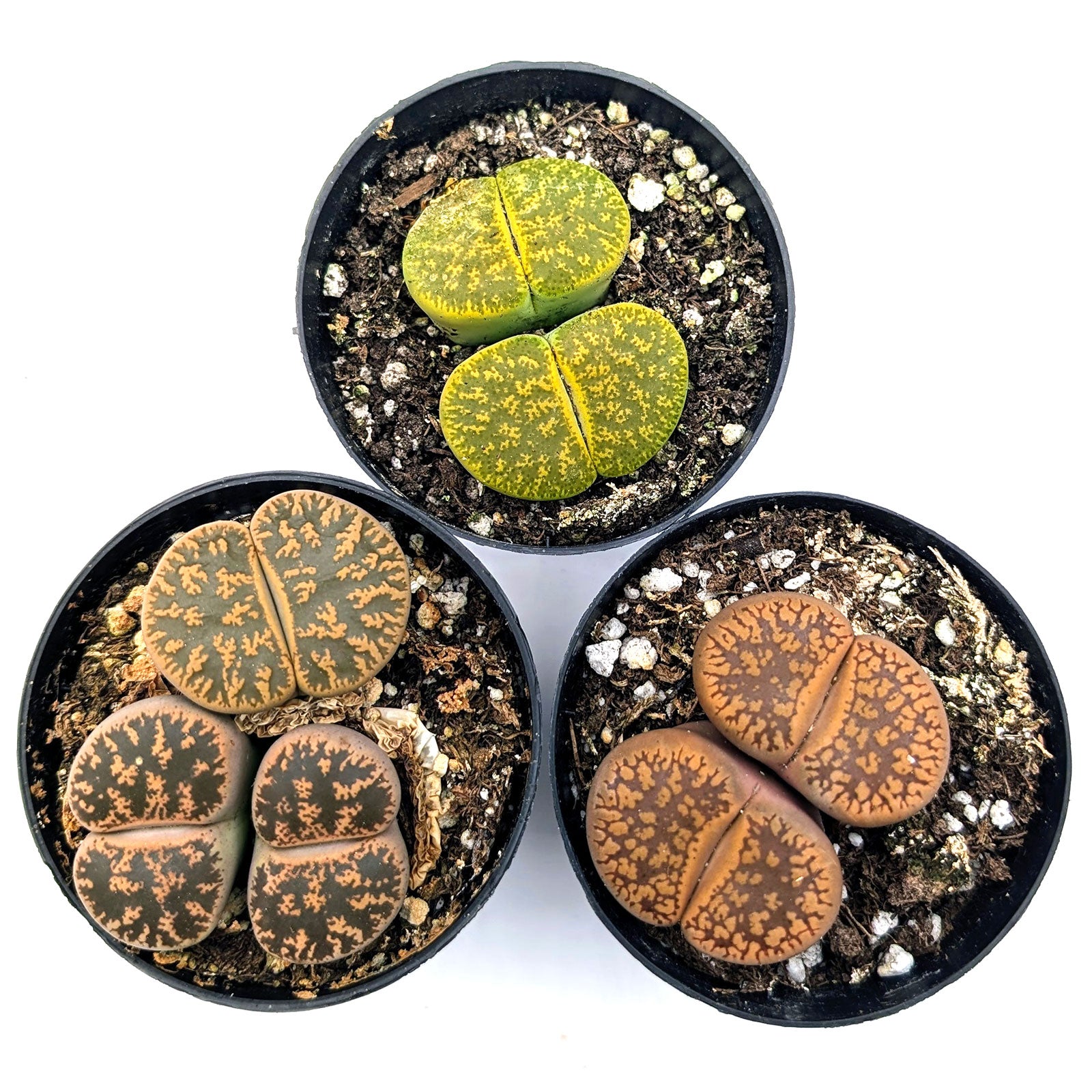 Also known as 'Living Stones,' Lithops are a petite succulent comprised of small, multicolor, and immensely fleshy leaves designed to resemble the stony landscape of their South African homeland. As is the case with most mesembs, or mimicry succulents, a majority of the plant lives underground, where the long taproot stores ample water and nutrients to support growth amidst drought conditions.