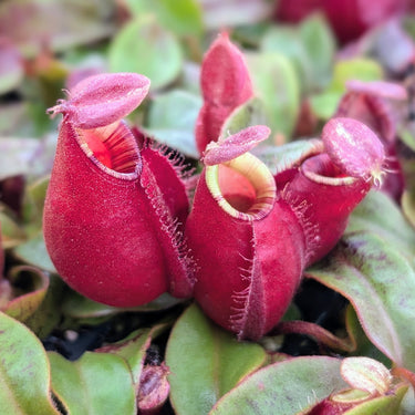 Nepenthes 'Black Miracle' is a mesmerizing tropical pitcher plant prized for its bold coloration and compact form. Its deep maroon to nearly black pitchers boast a velvety texture with pronounced ridges and a flared peristome that adds dramatic contrast against lush green leaves. These striking pitchers are not only ornamental but functional—luring and digesting insects with ease. A natural conversation piece, 'Black Miracle' thrives in bright, indirect light with high humidity and well-draining, acidic soil. Perfect for terrariums or indoor tropical plant displays, this rare beauty brings an exotic flair and a touch of the wild to any plant collection.