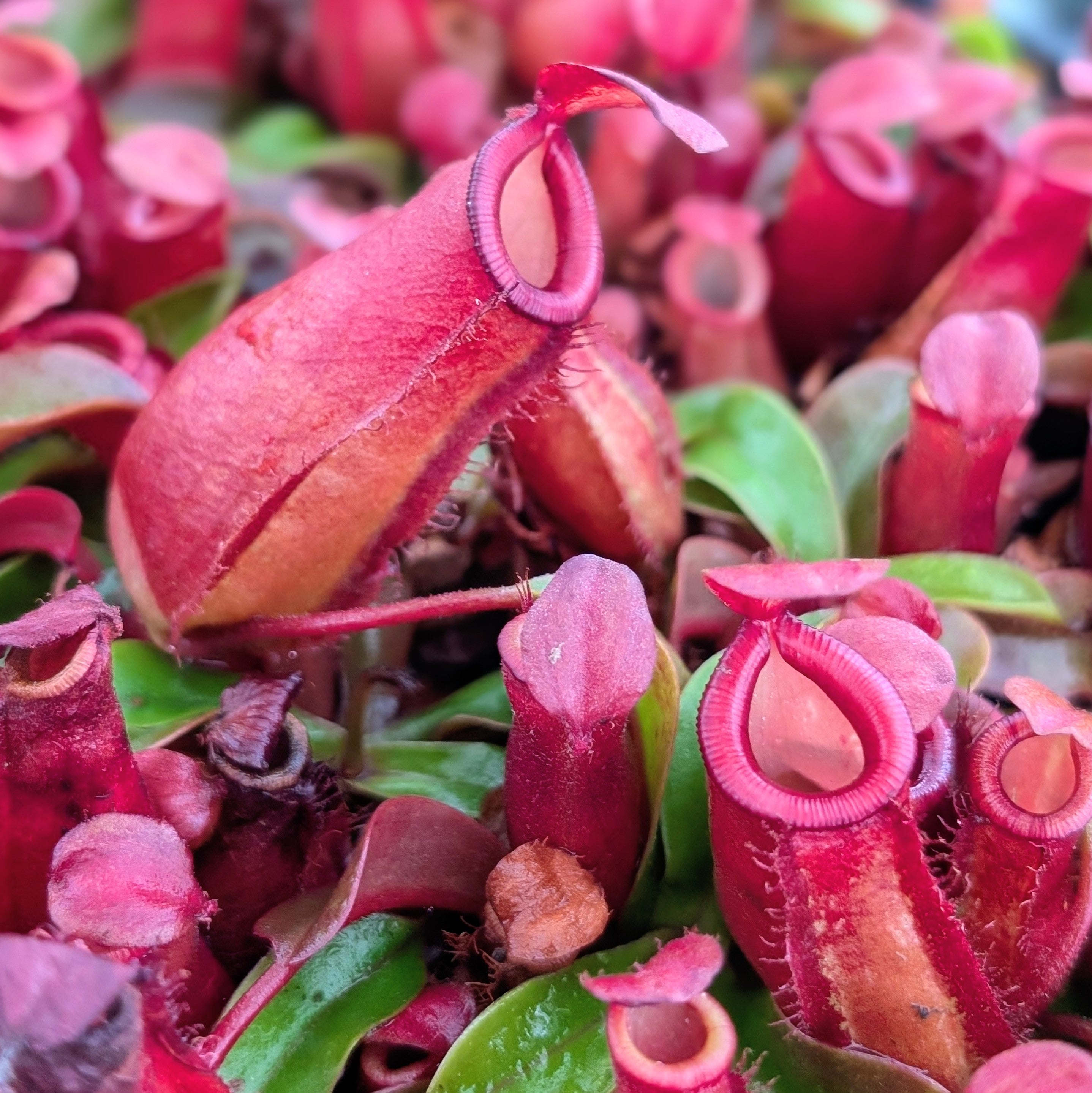 Nepenthes 'Bloody Mary' is a visually striking hybrid tropical pitcher plant, celebrated for its compact growth and intense coloration. Its vibrant crimson pitchers are short, stout, and beautifully contrasted by a deep red peristome, giving the plant its dramatic and memorable name. The lush green to red foliage further enhances its bold aesthetic, making it an eye-catching addition to terrariums, windowsills, or carnivorous plant collections. ‘Bloody Mary’ thrives in bright, indirect light with high humidity and consistently moist, acidic soil. Easy to grow and highly ornamental, this cultivar is perfect for beginners and collectors alike seeking a compact, exotic showpiece.