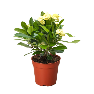 • Description: Crown of Thorns is a deciduous, herbaceous, perennial shrub with bright green leaves and greenish flowers. The flowers are enclosed within long-lasting and bright bracts of red or yellow. The plant is loose in form, spiny and irregularly shaped, with thick, black spines and its historic presence in the Middle East led to the belief by some that the stems of this plant had been used in Christ's crown of thorns, hence the common name. In its country of origin (Madagascar) the plant will grow to 5 or 6 feet tall; however, in the United States, it typically grows to 3 feet, or 2 feet when grown as a houseplant.