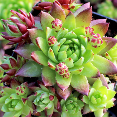 Introducing the striking Sempervivum globiferum ssp. hirtum 'Emerald Spring', a hardy succulent that hails from the mountainous regions of Europe. This perennial beauty showcases rosettes of fleshy, green leaves that are tipped with an enchanting red hue, creating a vibrant contrast that mimics the fresh bloom of spring. The 'Emerald Spring' variety is adorned with fine, white hairs that give the plant a slightly fuzzy appearance, adding to its unique charm and appeal.